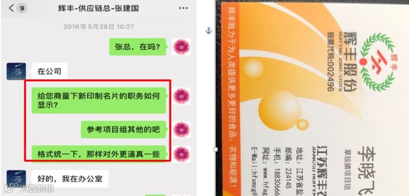 也正是在可转债发行后,原本在*ST辉丰内部称为“石家庄瑞凯(辉丰)三期项目”,突然改称“辉丰HF06项目”。2016年5月28日,*ST辉丰供应链总经理张建国发微信给瑞凯化工草铵膦项目负责人李晓飞,要求她将石家庄瑞凯公司的名片修改为辉丰股份草铵膦项目组经理,并称“格式统一下,那样对外更逼真一些。”