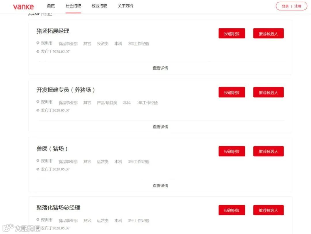 “招募令”显示,万科招聘包括猪场拓展经理、聚落化猪场总经理、养猪场预结算专业经理、猪场开发报建专员、猪场兽医在内的5个社招岗位,工作地点均在深圳。