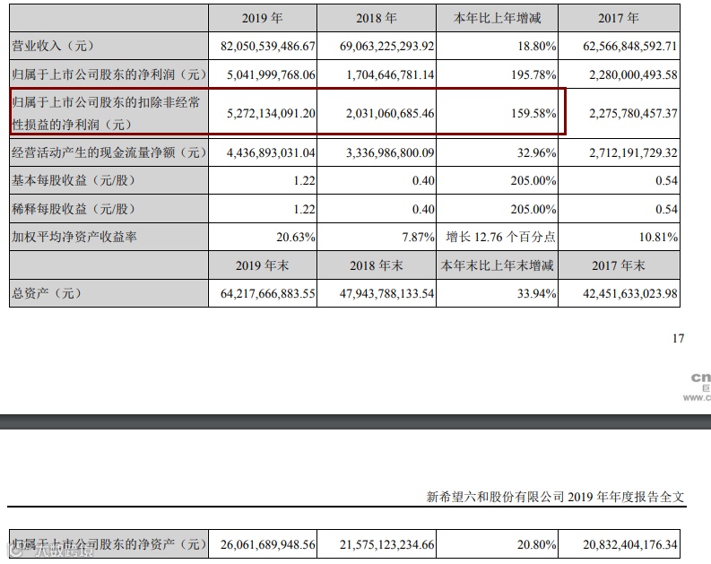 财报显示,新希望2019年营收820.51亿元,同比增长18.8%;净利润50.42亿元,同比增长195.78%;每股收益1.22元。