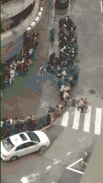 行人只能死死把住路边的围栏,才不会被吹跑↓