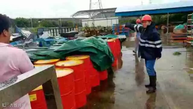 图:副总经理潘志明带领仓库管理人员冒着风雨将帆布撤离