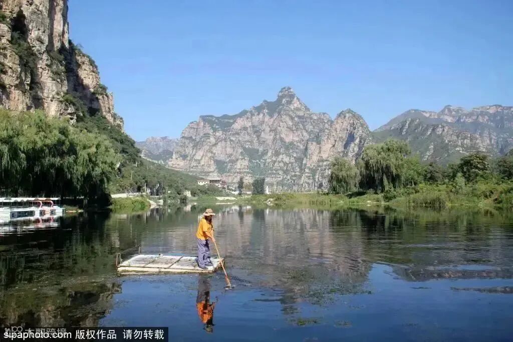 拒马河两侧即是喀斯特地貌景观,十渡峡谷曲流回转,湾阔水深,渡渡可乘舟划船,青山野渡美景如画。