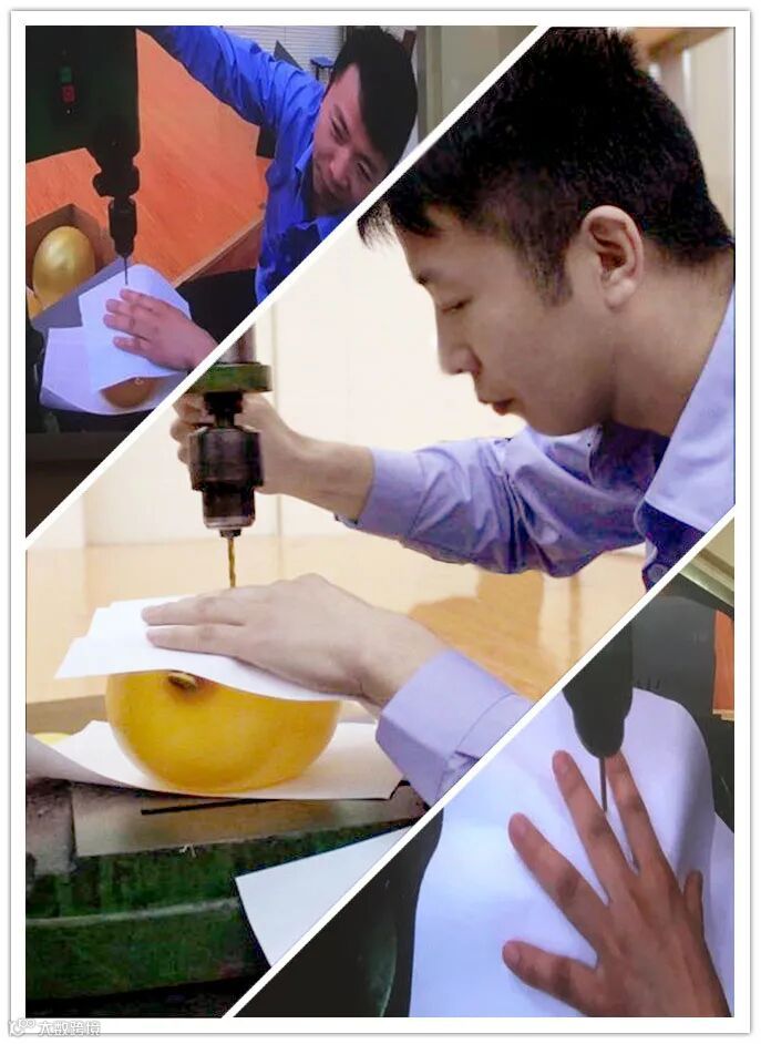 画面中,黄师傅坚毅沉着的眼神聚精会神的盯着高速旋转的钻头,而钻头下面是一个鲜艳的圆鼓鼓的气球,这是黄宝安师傅的绝活表演——钳工钻气球。观众们屏气凝神,提心吊胆看着手起“钻”落,唯恐任何一个声音的发出都会影响黄师傅发挥使气球爆破,漫长的一分钟过去,黄师傅气定神闲的举起手中的钻出小圆孔的纸,对准镜头,屏幕上出现了一个很多个小圆孔拼成的“心”形,欢呼声、雷鸣般的掌声此起彼伏,这颗爱心承载着黄师傅对这份事业的初心与满满的热爱。看似一个戏剧化的表演,在刚与柔之间,内行人都知道,这项表演无论是对钻头的加工工艺、材料尺寸和加工力度的拿捏,都非常考验师傅的技术。