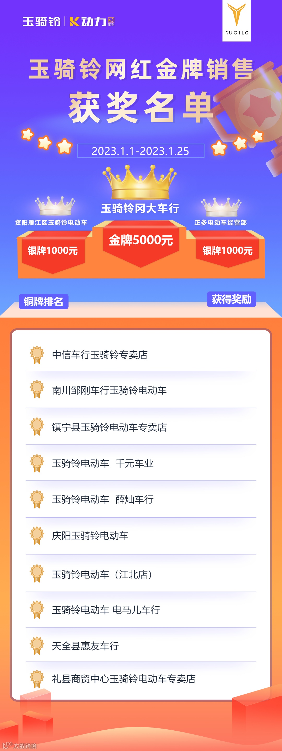 2月13日,2023年玉骑铃网红金牌销售塑造计划活动第一期(1月)获奖名单出炉,本次评选通过上百位参与者1月份的精彩角逐,累计获得200万+流量,取得了2023年流量的开门红,让玉骑铃的品牌价值得到了进一步的提升。