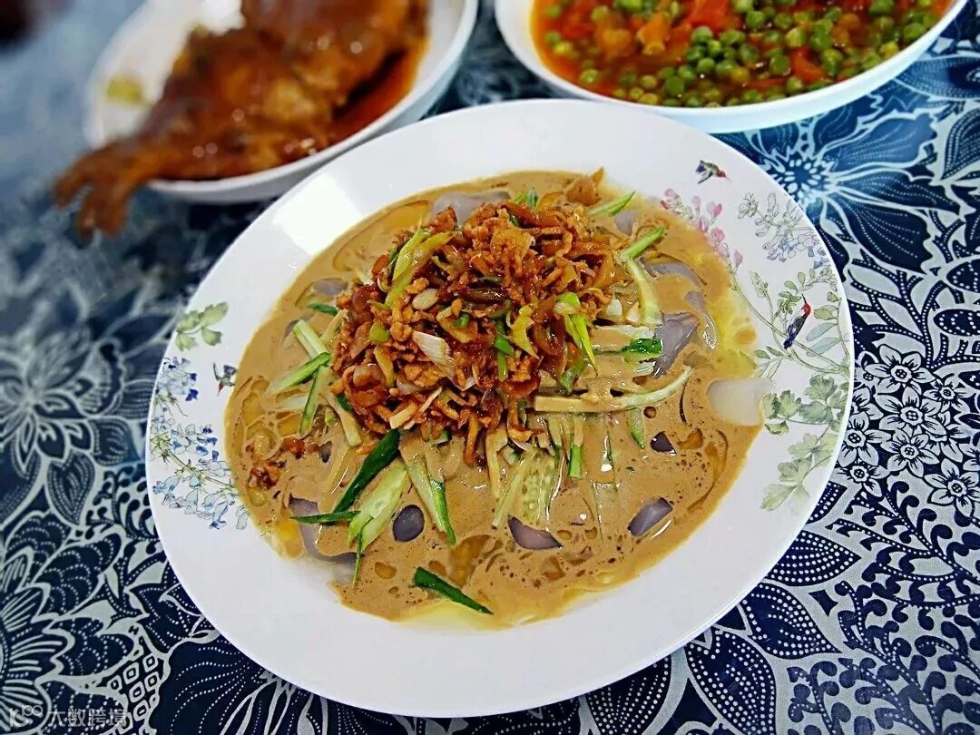 澥好了的麻酱与煮熟的豇豆随吃随拌