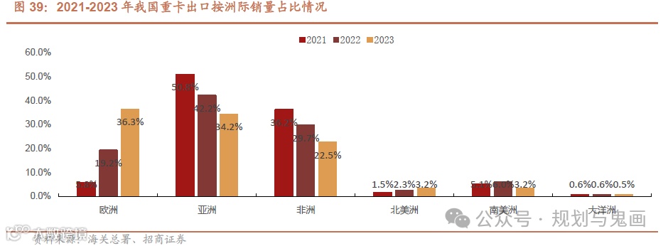重卡市场需求激增及一带一路倡议所带动。在出口结构方面,目前以亚非拉俄地区为主,2023 年我国重卡出口欧洲/ 亚洲/ 非洲/