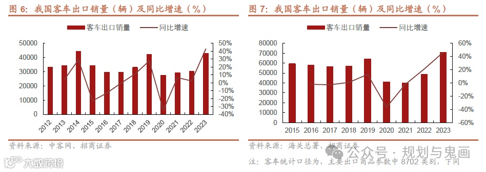 海外市场需求恢复,2023 年中国出口海外客车销量高增。根据海关总署数据显示,2015-2019 年,我国客车出口销量相对稳定,2020-2022 年,出口海外客车销量处于低迷状态,2022 年下半年海外市场需求逐渐恢复,客车出口提速。2022年出口客车4.8 万辆,同比增长21.3%,2023 年我国出口客车7.1 万辆,同比增长46.3%,销量显著增长。根据中客网数据,2023 年中国客车共出口客车4.3万台,同比增长43%。