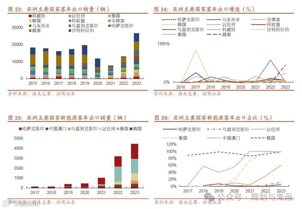 2023 年亚洲市场主要国家客车出口销量显著增长,新能源客车出口提速。亚洲(除中国大陆)是我国客车最大出口市场,其中,中东的