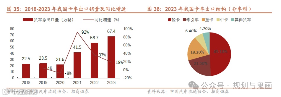 根据中国汽车流通协会,货车可以细分为轻卡、中卡、重卡、牵引车、其他货车。2021 年我国卡车出口总量达 41.5 万辆,同比增速92%,实现接近翻倍增长;2022 年卡车出口量达到56.7 万辆,同比增速37%,2023 年卡车出口量再创新高,达67.4 万辆,同比增速19%,刷新中国卡车历史出口销量记录。2023 年我国卡车出口结构,分车型情况来看:轻卡出口量33.1 万辆,同比下滑0.3%,占卡车出口总量比重49.1%;中卡出口量4.3 万辆,同比下降5%,占比6.4%;重卡出口量12.3 万辆,同比增长39%,占比18.2%;牵引车出口量达14.5 万辆,同比大幅增加92%,占比21.5%;其他货车出口量3.2 万辆,同比增长29%,占比4.7%。近两年,中轻卡出口销量增长有所放缓,占卡车出口量比重呈下滑趋势,两者合计占比由2021 年的68.2%下滑至2023 年的55.5%;重卡及牵引车出口销量增长提升明显,两者合计占卡车出口量比重由2021 年的29.9%上升至2023 年的39.8%。