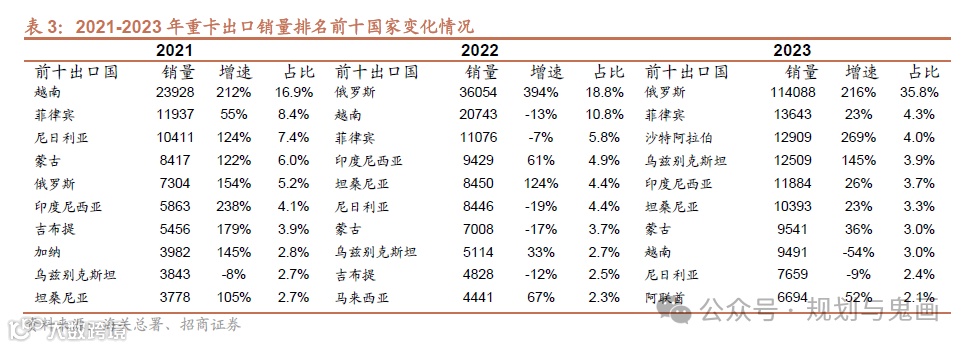 过去三年我国重卡出口实现持续高速增长,主要有以下几个关键因素:1、全球局势动荡,2022 年俄乌冲突,地缘政治因素下,导致俄罗斯市场对我国重卡需求激增,贡献超高增量;2、受益于“一带一路”倡议,中国基建企业加速出海,同时亚非拉等地区以发展中国家为主,基建需求旺盛,为我国重卡出口带来了发展机遇;3、全球疫情影响下,我国重卡企业供应交付能力较强、同时产品力、品牌力全面提升。