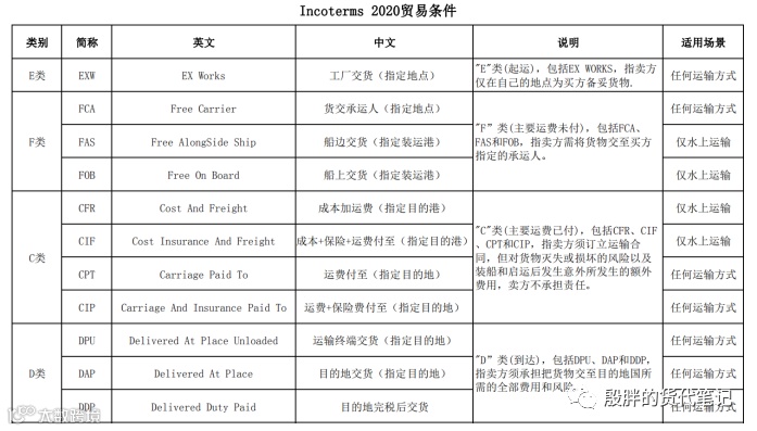 与工厂交货(EXW)形成鲜明对比,在整个交付过程中,卖方将几乎承担了将货物运至约定地点过程中的所有费用、风险及责任; -