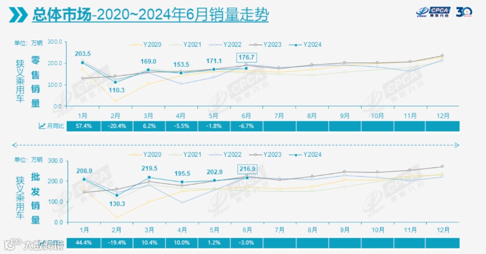 7月8日,乘联会发布6月份国内乘用车销量数据,数据显示,6月全国乘用车市场零售176.7万辆,同比下降6.7%,环比增长3.2%;今年上半年,国内零售销量仅在1月和3月分别同比增长57.4%和6.2%,4~6月零售持续负增长,得益于1月创造的超74万辆的新增量,今年上半年累计零售984.1万辆,同比增长3.3%。