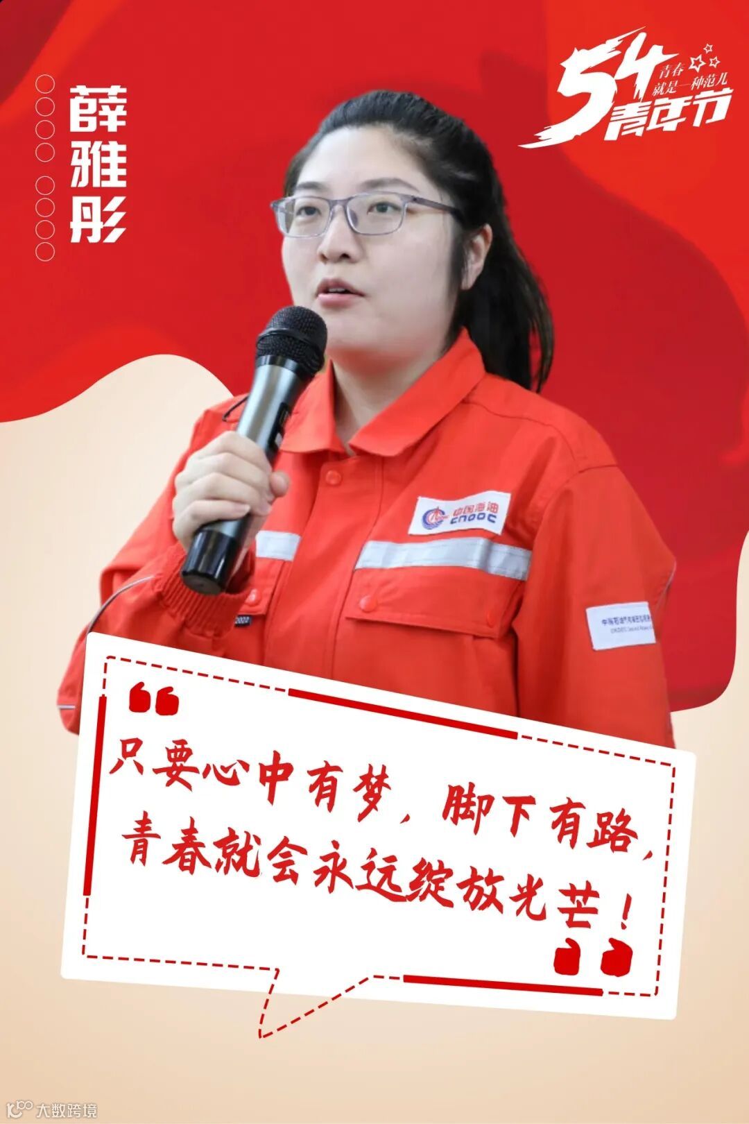 作为海油青年,我将始终坚定理想信念,努力提高自身素质、锤炼过硬本领,在平凡的岗位上默默耕耘,用点滴之力彰显青春,为公司高质量发展贡献青春力量!