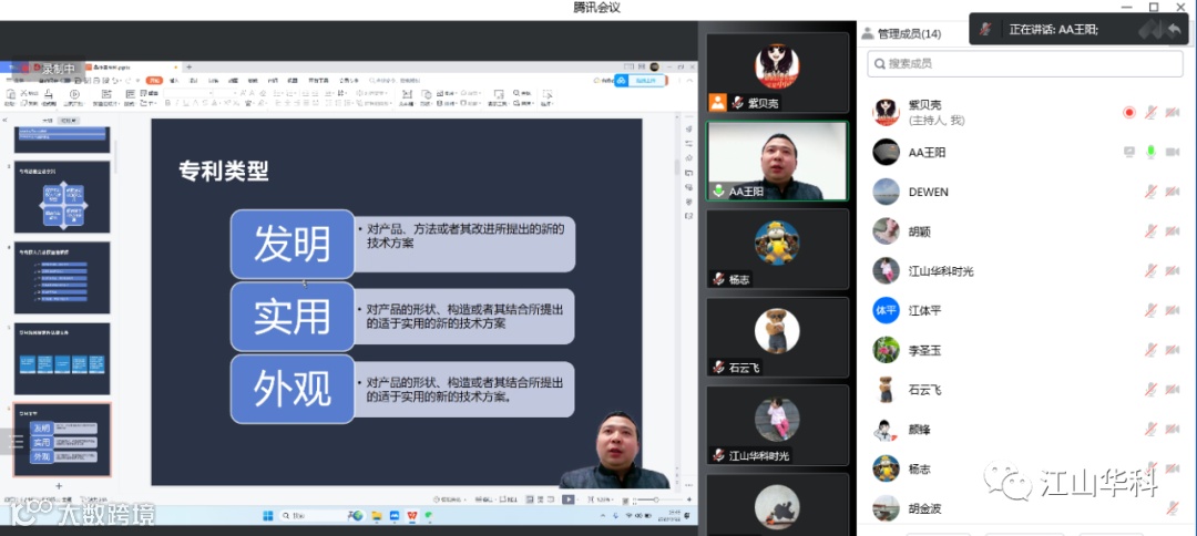 此次讲座线上进行,以专利理论知识为基础,重点讲解了专利文献的撰写规范。主讲老师王阳将基本理论和案例相结合,对如何在工作中发现、挖掘“专利”进行了详细生动的讲解,帮助大家提炼在日常研发过程中可能形成专利的观点或方案。