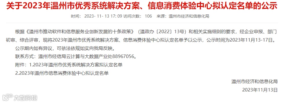 为深入实施数字经济创新提质“一号发展工程”,高质量落实《温州市推动软件和信息服务业创新发展的十条政策》,根据《温州市数字经济产业园区认定办法》《温州市优秀系统解决方案遴选办法》《温州市信息消费体验中心认定办法》,温州市经济和信息化局组织开展2023年温州市数字经济产业园区、优秀系统解决方案和信息消费体验中心申报认定工作。