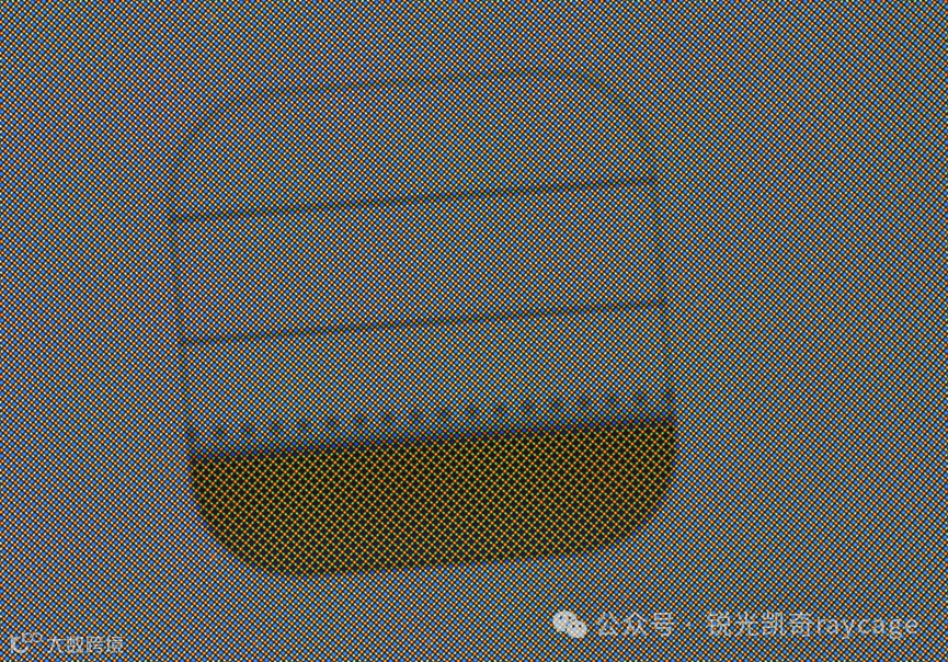 这是小编的手机屏幕的一个图标,黄色区域经过放大后能看到实际上只有R\G\B三个颜色,只是区域内蓝色较弱。