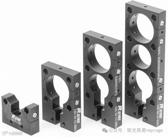 多孔固定支撑座一共有4种:无孔、单孔、两孔、三孔;都起支撑作用,只是孔数和高度不一样,根据系统里面器件尺寸选择合适的光轴高度即可,支撑座中间的大孔为通光孔,光线从正中间通过,支撑座与支撑座通过笼杆连接之后,同一个高度通光孔之间高度重合,正确固定之后XY及俯仰误差比较小。支撑座两边的小孔为笼杆孔,笼杆通过这些小孔固定,区别于顶丝缩紧,这种有开口的锁紧方式更加稳定,采用这种方式可以很大程度上避免干涉条纹的抖动,提高系统稳定性。