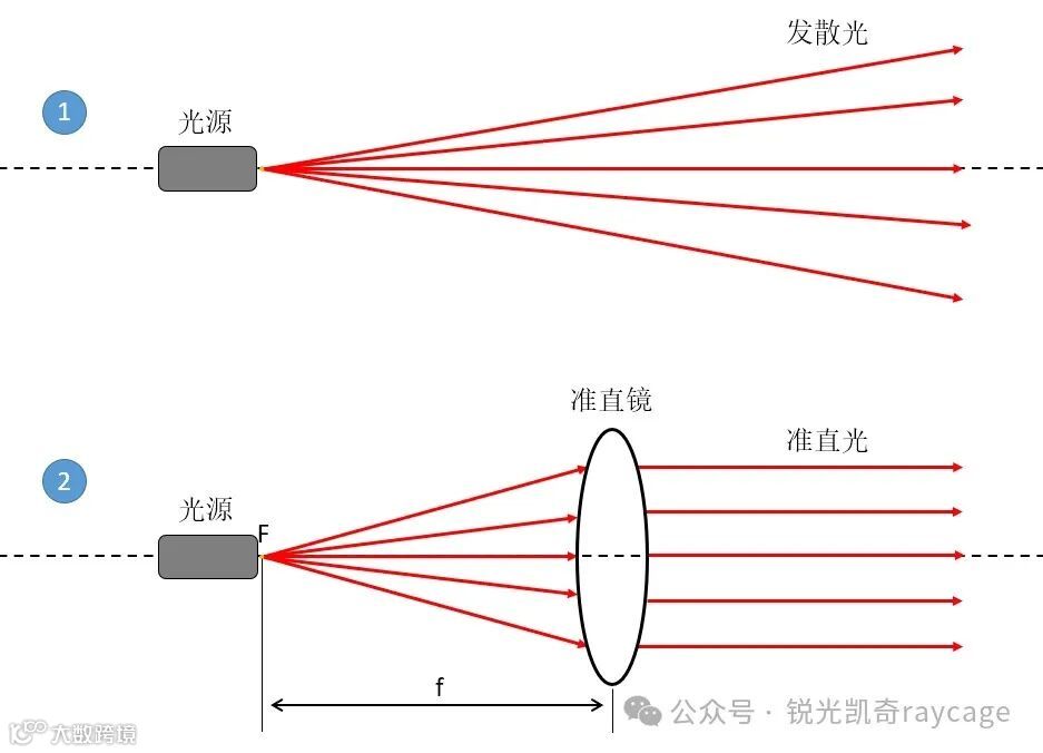 通常光源发出的光线是以一定的角度发散传播的,即开始位置的相邻两条光线在传播过程中会相离越来越远。准直通俗的说就是将发散的光变成平行光,这样能实现远距离传输和照明,同时准直后的光具有光强均匀的特点,适用于需要均匀照明的场合。