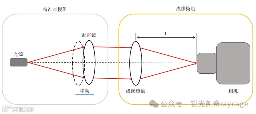 成像的判断方法也比较简单,首先将一个相机和一个透镜置于系统中并将相机靶面调整至透镜的后焦面组成一个成像模组(该模组可对无穷远处发射过来的光进行成像),然后将该模组置于经过透镜准直输出的光路中,移动光源或者透镜使相机上得到光源灯珠清晰的像,此时的位置便是扩展光源准直的最佳位置。