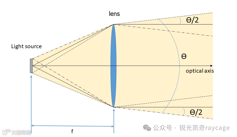 点光源的定义是理想化为质点的光源,而质点的定义又是有质量但不存在体积或形状的点。也就是说生活中遇到的光源都不是严格意义的点光源,都是具有一定的发光面积,是不同位置的无数点光源的一个集合,将这种光源称为扩展光源。扩展光源进行准直时,处于透镜焦平面上不同位置的点光源发出的光线经过透镜后也都变成平行光,但是只有焦点处发出的光线经过准直后平行于光轴,其它位置的点光源发出的光线经过准直后都跟光轴存在一个夹角,因此当所有的光汇集在一起的时候总的光束是发散的,光斑是逐渐变大的。这个时候可以使用成像的方法去判断并且调节。
