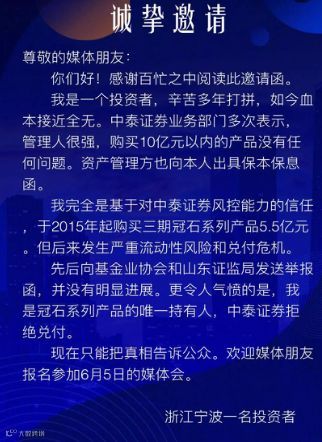该产品遭遇评级下调、违约等情况,流动性受限,产生兑付危机。更让朱姓投资者想不到的是,他是整个冠石产品的唯一持有人。本是大户,却被这样华丽丽地“割了韭菜”,于是他决定开场媒体发布会质问中泰证券。
