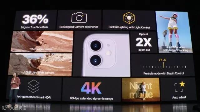 iPhone 11的视频拍摄能力也得到了增强,可支持4K 60fps,慢动作,延时摄影,动态范围也得到扩展。苹果声称,iPhone 11的视频拍摄能力是智能手机中最强的。