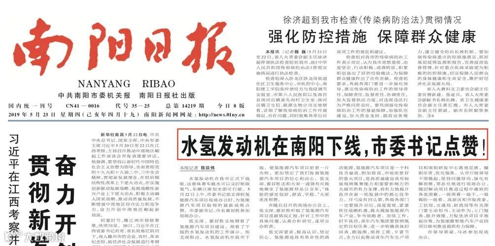 5月23日,河南《南阳日报》头版发布了《水氢发动机在南阳下线,市委书记点赞!》的文章,其中说到“水氢发动机在我市正式下线,这意味着车载水可以实时制取氢气,车辆只需加水即可行驶。”