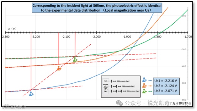 下面我们来重点观测,对应于365nm不同入射光光强度 Iν,施加反向电压U从-2.36V至0.000V测定光电流 IA 实验数据,将数据标绘分布曲线来观察单色入射光光强Iν 的调控对最小反向遏制电压Us 的影响,我们就得到了与P.雷纳德实验结论完全不同的实验证据,如下图所示。