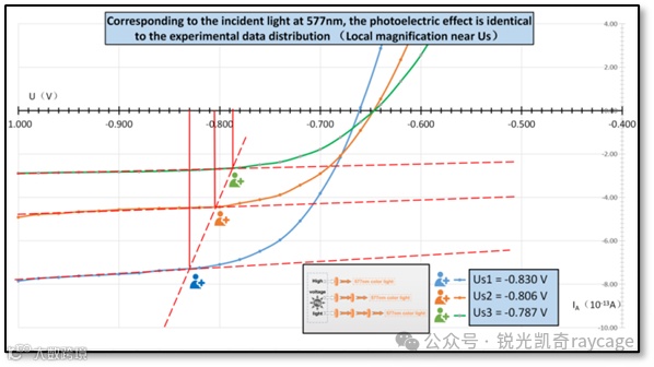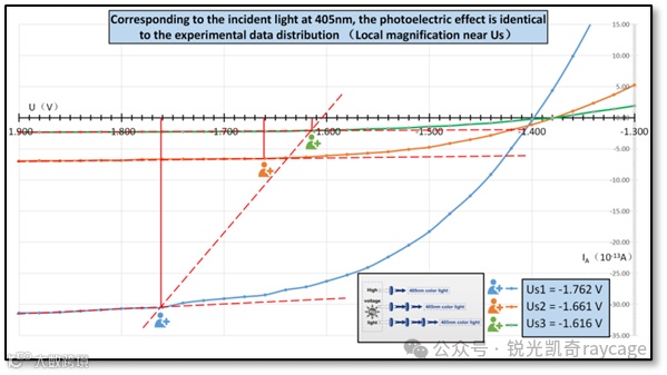这里我们看到实验数据的分布证实了P.雷纳德得出的入射光光强度 Iν 越高,正向光电流 IA 越大的结论。