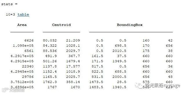 图7. 10个白色区域的面积,重心,边界框数据列表
