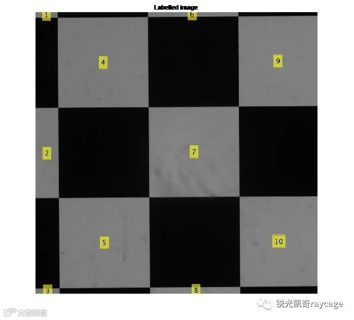 使用视频1的系统的相机拍摄的图像如图5所示。然后对图5进行计算机图像处理,用MATLAB编写的程序代码见附录。程序第一段是读入图像并显示。第二段是将灰度图像转换成如图6所示的二值(黑白)图像。第三段第一行的函数regionprops() 对每个白色区域的面积,重心和边界框进行统计,统计结果见图7。其中面积以像素的个数来表示,重心以x,y坐标表示,边界框用4个数值表示,第一,二个数值是矩形左上角的x,y坐标,第三,四个数值分别是矩形的宽度和高度,以像素的个数表示。然后给每个白色区域打上标签,如图8所示,可见一共有10个白色区域。容易看出只有4,5,7三个矩形是完整的,因此第四段第一句是筛选出这三个矩形,其余矩形不予考虑。第二句是提取这三个矩形的边界框的数据,并将它们写入二维数组BoundingBoxes。从图7可以看出,第4,5,7三个矩形的宽度和高度均等于660个像素。最后一句是计算3个正方形边长的平均值,为660个像素,乘以CCD像素大小0.0055mm,再除以理论放大率0.9,得到正方形边长的测量值为4.033mm,比标准值大了0.033mm。在以后的测量中,需要将测量值减去0.033mm。