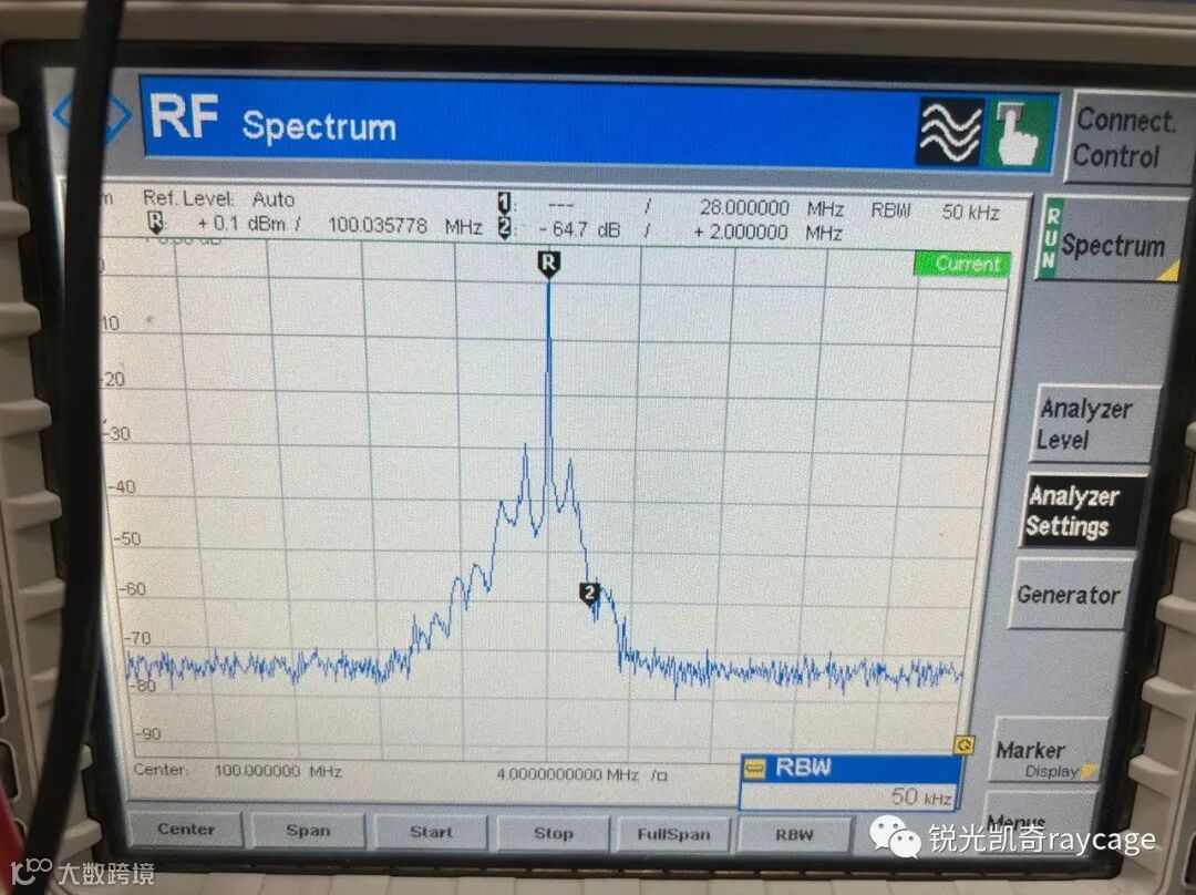 如图3所示,先通过频谱仪读取外差信号的频率,从图中可以看到,信号频率为100MHZ: