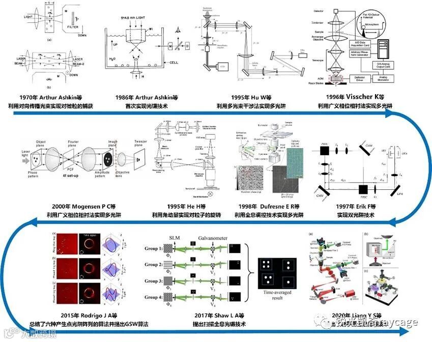 随着仪器设备与理论分析的深入,单光束对单个粒子进行三维捕获的单光阱已经很难满足许多应用场景对光镊技术的需求。之后的三十年间,光镊技术得到了飞速的发展,已经从简单的光学捕获(Optical Trapping)、光学输运(Optical Guiding)等功能发展为利用多种新型光束实现光致旋转(Optical Rotation)以及粒子的自由空间自加速等,光场也由点光阱、涡旋光场等简单光场逐渐实现了轴平面捕获与成像、三维任意路径光场等(图3)。