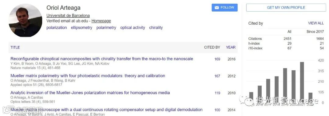我所在UB的研究组是由 EnricBertran Serra负责能源、光子学和催化材料 (ENPHOCAMAT)小组,有29名成员(包括教授、研究员等),其研究范围包含了纳米材料、薄膜材料以及材料的光学、电光和电化学测量等。我所跟随的老师Oriol Arteaga Barriel,是巴塞罗那大学应用物理系的Ramón y Cajal 研究员,曾经在纽约大学Bart Kahr Group做博士后研究员。与国内有所不同的是,这边的一个方向只允许有一个教授,也没有副教授这一称号。Oriol研究的方向大部分涉及与光的偏振有关的光物质相互作用,十分擅长光谱偏振测量仪器的设计与搭建(旋光仪、椭偏仪、荧光仪和圆二色仪)和偏振调制技术与傅里叶变换分析相结合的专业知识分析。Oriol自行设计了Mueller 矩阵显微镜、Mueller矩阵椭偏仪和Mueller矩阵成像椭偏仪等,并对这些仪器不断优化升级。目前实验室所设计的基于光弹调制器的全穆勒矩阵椭偏仪精度和稳定性非常高,是很多商业仪器无法达到的。这在解决纳米薄膜厚度、微弱光学各向异性等测量方面提供很大的帮助。最近在很多有影响力的期刊Nature materials, Optics letters,Optics Express,ACS nano,Applied Optics等发表多篇论文,2017年至今文章被引量为1664。