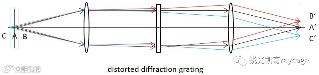 利用变形光栅这个性质,可以将一个物平面上的物体同时成像在三个像平面的不同位置上,见图2,或将三个物平面上的物体同时成像在同一个像平面的不同位置,见图3。