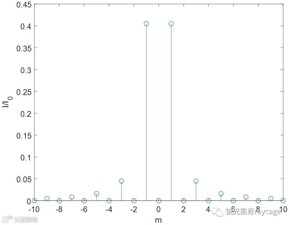 其中P = h(n-1)/λ,h为刻槽深度,n为折射率,λ为波长。如果适当选取h,n,λ的值,使P = 1/2,即在一个光栅周期内位相变化π,那么零级和所有偶数级次强度为零,±1级强度相等,见图5。如果P = 0.3195,即在一个光栅周期内位相变化0.639π,零级强度不为零,且和±1级强度相等,各占总入射光强的28.8%,总的衍射效率可达到86%,见图6。