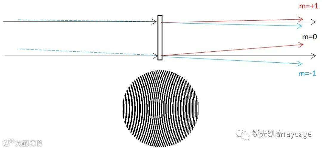 普通光学显微镜每次曝光只能对一个物平面成清晰像,若要得到不同物平面的清晰像,必须经过调焦后再次曝光。显然,普通光学显微镜无法同时得到物体内部各个不同深度层次的清晰图像。同步多平面显微成像技术就是为克服这个缺点而出现的。这种技术可以通过一次曝光,同时得到若干幅物体在不同深度平面的清晰像,因此特别适合观察三维动态物体,比如活细胞等生物样品。同步多平面技术的关键元件是变形衍射光栅,它是上世纪九十年代英国赫瑞瓦特大学Heriot-Watt University的Alan Greenaway教授首创的[1]。变形衍射光栅类似于一个具有正,负和零光焦度的多焦点透镜,但焦点不在同一条光轴上,实际上是一个偏心的菲涅尔波带片,见图1。当平行光束垂直入射到变形光栅后发生衍射,图中红色代表+1级衍射光束,是向上偏的汇聚光束,光栅表现为一正透镜。黑色代表零级衍射光束,是平行光束,光栅表现为一平行平板。蓝色代表-1级衍射光束,是向下偏的发散光束,光栅表现为一负透镜。光栅的±1级焦距为f±1=±R2/(2W20),其中R为光栅通光半径,W20为离焦系数,代表栅线的弯曲程度。
