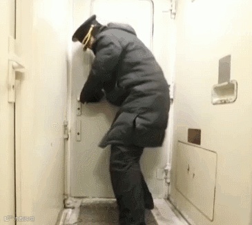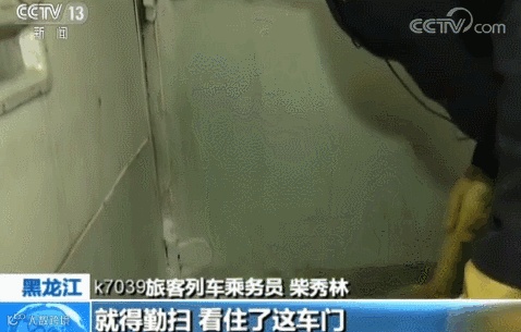 乘务员把门缝里的冰铲掉后