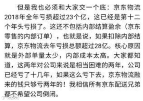 最近几个月内,京东内部人员震荡,先是高管团队频繁离职,后京东取消配送员底薪的决定,受影响范围近18万人,人事风暴无疑加重了京东生存的焦虑。刘强东上周五发布内部邮件表示,京东物流2018年全年亏损超过23亿,这已经是亏损的第十二个年头。如果扣除内部结算,京东物流去年亏损总额超过28亿。
