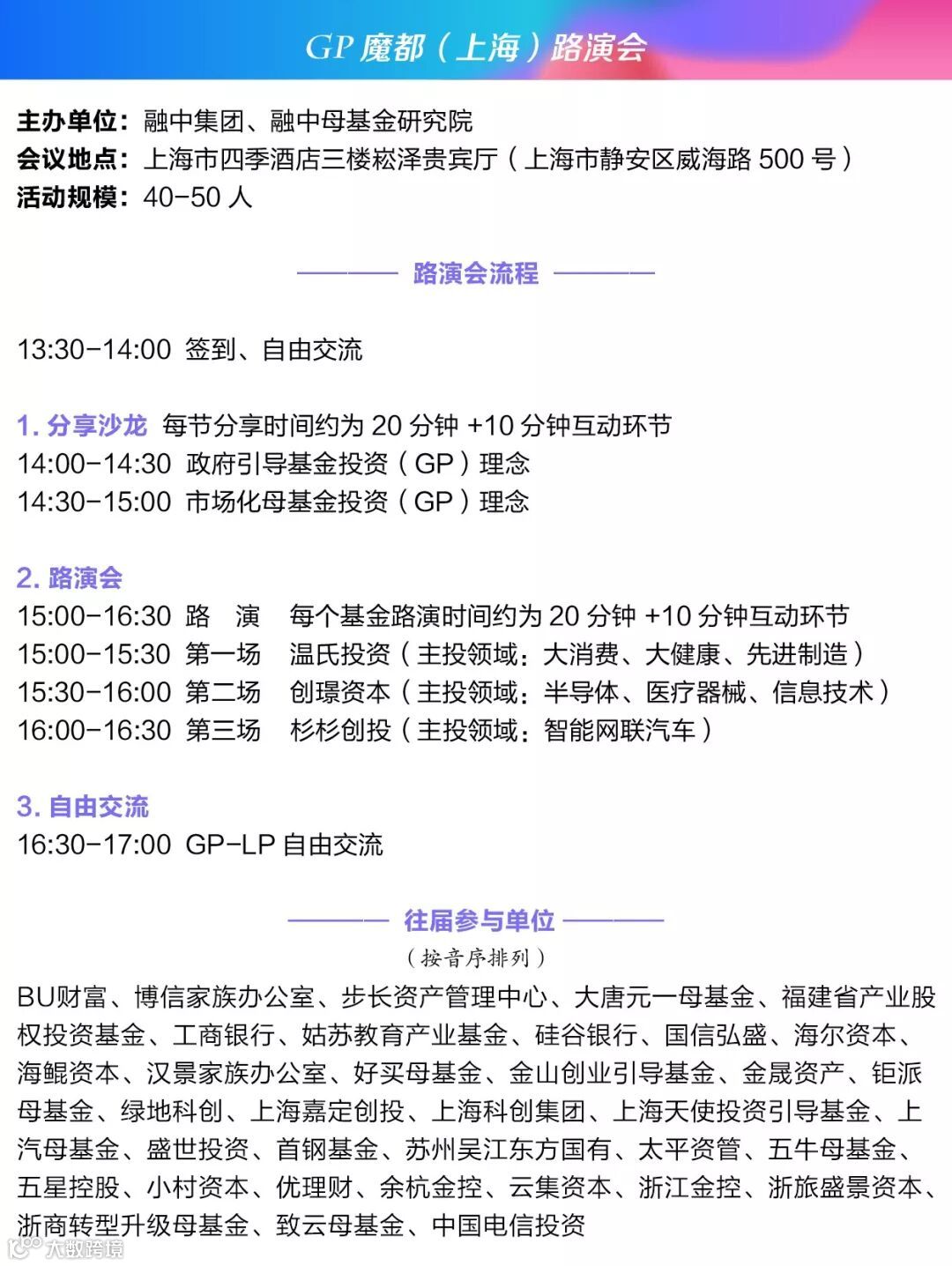 本次活动由融中母基金研究院发起的年度例行路演会。本次活动筛选了来自国内3家优秀的GP,采取基金管理人现场演讲与LP互动交流的形式,针对有需求的多家知名LP、民间资本重点展示与推介。让投资人深入了解基金的管理团队、投资策略及过往业绩等,搭建高效的GP和LP对接平台,营造GP和LP面对面近距离交流机会,开启募资新途径,促成GP&LP的募-投资合作。