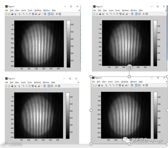 由于移相器严格步进产生相位π/2的变化,对环境要求严格。当使用纳米stage实现移相时,光线要到反射镜返回,因此stage移动波长/8。图4是四张实际的移相干涉图: