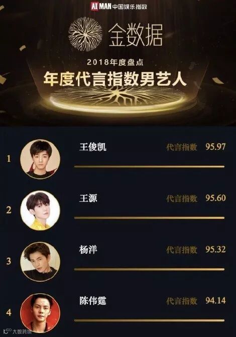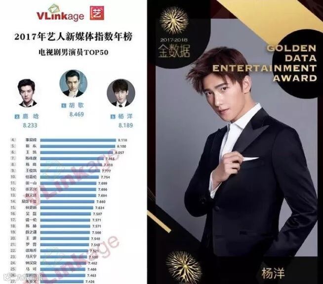 2017年VLinkage艺人新媒体年度榜单里,杨洋以8.189的指数排名年度第三,证明了其在新媒体强大的人气指数;“金数据”公布的2017-2018中国文娱大数据中,杨洋在“年度代言指数男艺人”中排名第三。