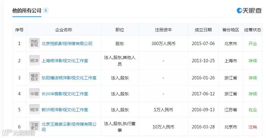 据天眼查信息,杨洋名下公司众多,个人商业版图已初见规模。他一共参股投资了17家企业,是6家公司的股东(包括已注销的1家),其中控股5家企业(包括已注销的1家),还在2家公司任职高管。