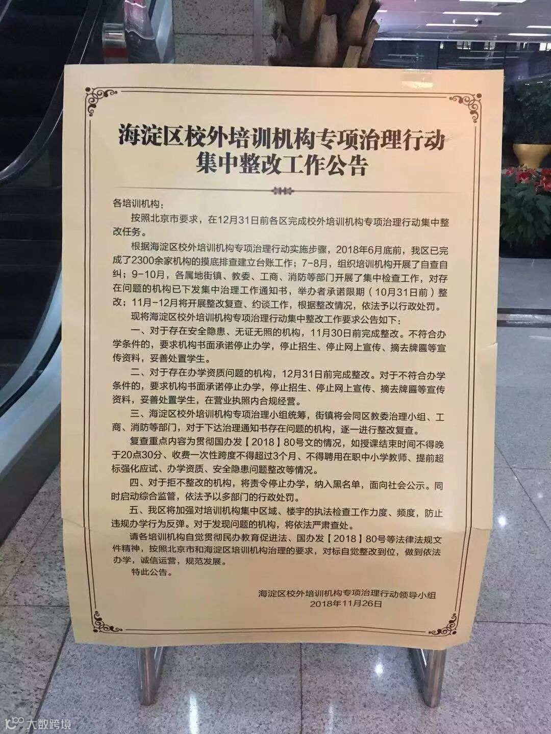 《21CBR》记者看到,银网中心的进门处和扶梯旁,贴有校外培训机构的整改公告,公告时间分别为2018年7月底和11月底,据11月发布的公告,12月31日前,北京各区需完成校外培训机构的整改,重点内容包括:授课结束时间不得晚于20点30分、不得提前超标强化应试等。
