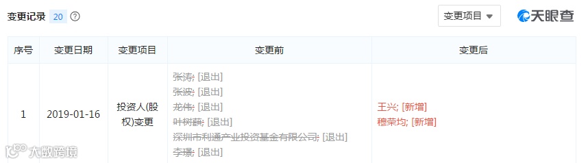 2019年1月16日,天眼查数据显示,大众点评主体上海汉涛信息咨询有限公司发生股权变更,大众点评创始人张涛等原股东全部退出,新增王兴和穆荣均。变更后,王兴占股95%,成为该公司实际控制人,并担任监事一职,法定代表人则由美团联合创始人穆荣均接任。换句话说,大众点评如今已经完全归美团王兴所有。