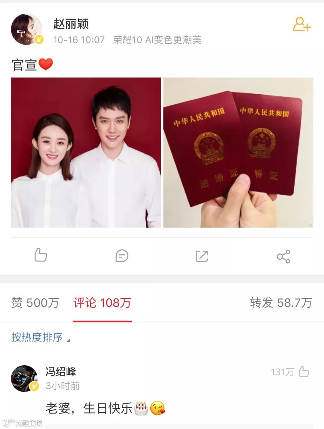 今日早间,演员赵丽颖和冯绍峰突然在社交平台微博上发布婚讯,导致在微博搜索相关词条时系统一度卡顿。而今天正好是赵丽颖生日,且将发布时间卡在男方生日的10点07分,冯绍峰随后在评论中回复“老婆,生日快乐”,众网友直夸狗粮撒的漂亮。