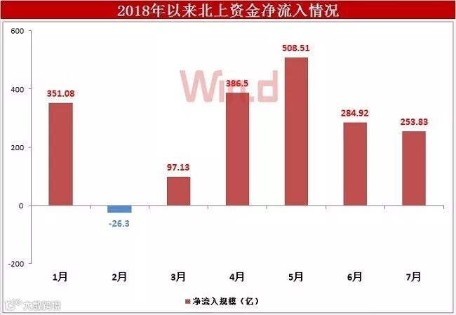 Wind统计显示,2018年以来,陆股通累计净流入规模已达1888.36亿元,同比去年增幅达58.81%,且远远高于同期南下方向的973.11亿元。而这也是北上资金连续第五个月净流入。