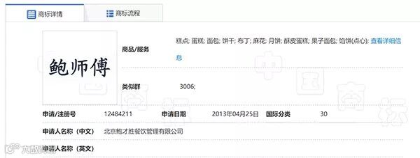 在餐饮相关类目里,鲍才胜注册得最早,2013年北京鲍才胜餐饮管理有限公司申请注册 “鲍师傅”商标,2014年正式获得“鲍师傅”商标所有权,用于经营糕点、面包等商品。