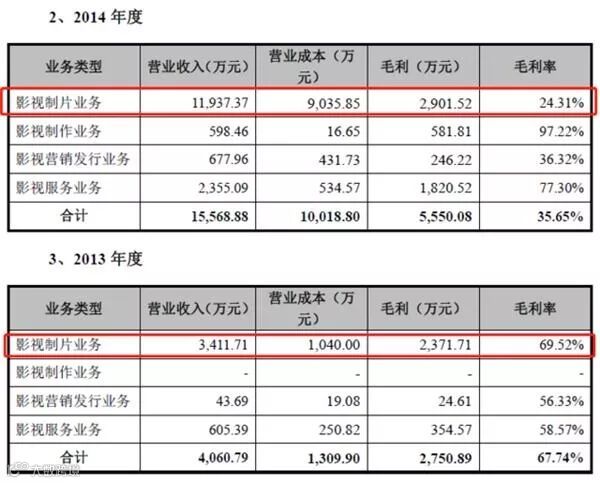 数据显示,公司2013年的电影销售收入全部来自于电影《小时代1、2》,后者实现销售金额3455.4万元;2014年和2015年,《小时代3、4》分别实现销售收入1.21亿元、1.09亿元,分别占当年电影销售收入的96.03%、85.44%。《小时代1、2》两部影片的毛利率高达69.52%,而随着《小时代3、4》的制作成本相比前两部增加了4100万元,总票房并未产生较大增幅,2014年,公司的影视制片毛利率相比2013年下降了45.21%。