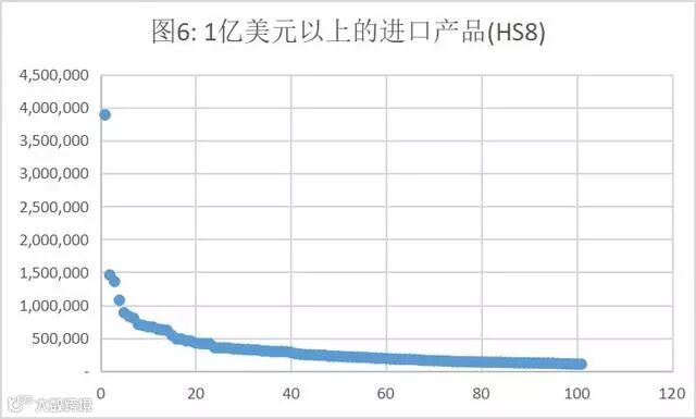 最后,我们还可以看一看这1300余项8位HS代码产品的进口值分布。有些意外却又合乎情理的是,美方301清单的打击面非常分散。图6给出了按照2017年美国从中国进口价值在1亿美元以上的产品——大致可以认为超过1亿美元的进口具备了一定的规模。在全部1333项产品中,只有101项超过这个标准,更只有4项超过10亿美元,分别是平面屏彩电(38.9亿美元),载人汽车(1500ml<排量≤3000ml)(14.6亿美元),印刷及印刷用辅助机器的零件(13.6亿美元),以及铝合金矩形板、片(10.8亿美元)。这种分散打击的策略与中方旋即推出的反制清单集中打击的方式完全不同。